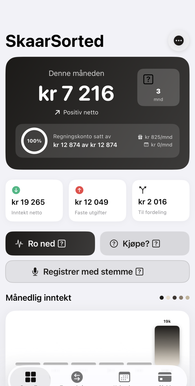 SkaarSorted hjelper deg å holde oversikt over inntekter, utgifter og gjeld – alt på ett sted. Appen er bygget for folk som vil ha et enkelt, visuelt system som faktisk fungerer i hverdagen.