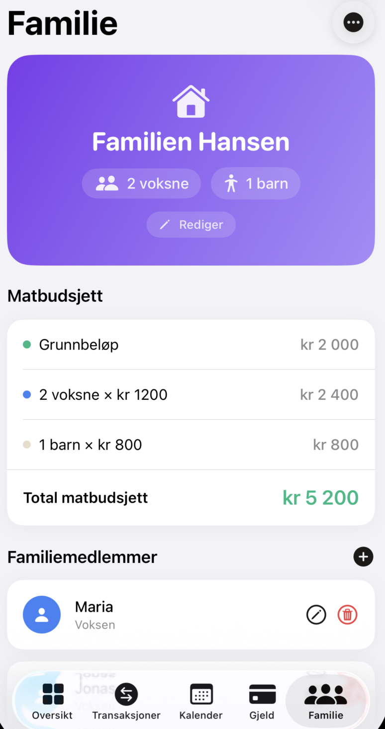 • Automatisk budsjettfordeling (mat, regninger, ekstra gjeld, moro)