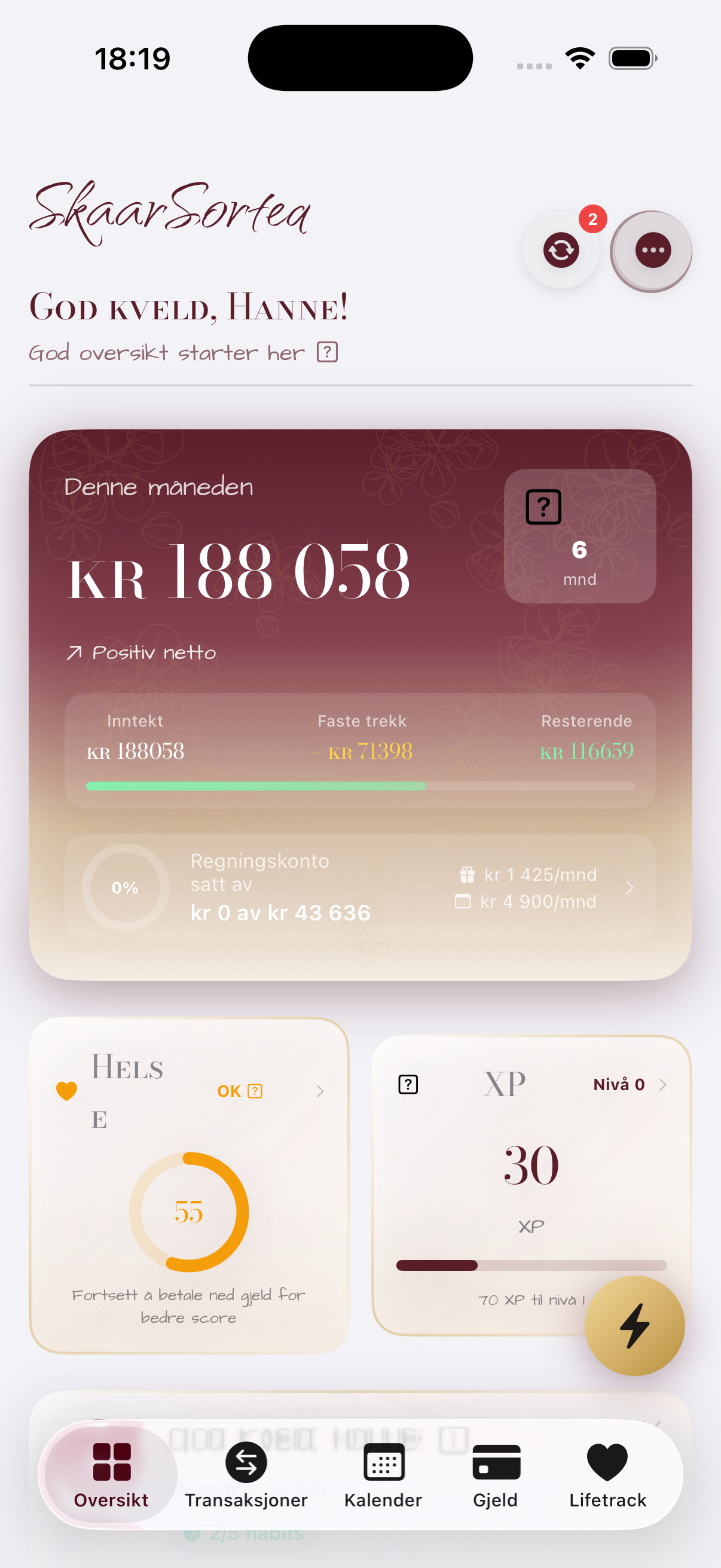 Skaar Sorted samler økonomi og livsstruktur i ett system. Plattformen hjelper deg å organisere budsjett, mål, gjeld, rutiner og planlegging på en enkel og oversiktlig måte. Målet er å gjøre det lettere å ta gode valg, skape struktur i hverdagen og jobbe mot en mer stabil og trygg fremtid.
